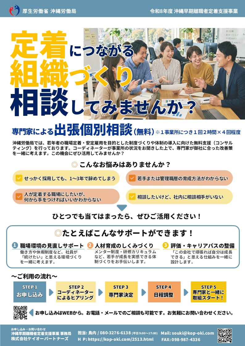 沖縄労働局では、沖縄県の雇用の改善と、若年者を中心とした早期離職防止、職場定着の促進を図ることを目…